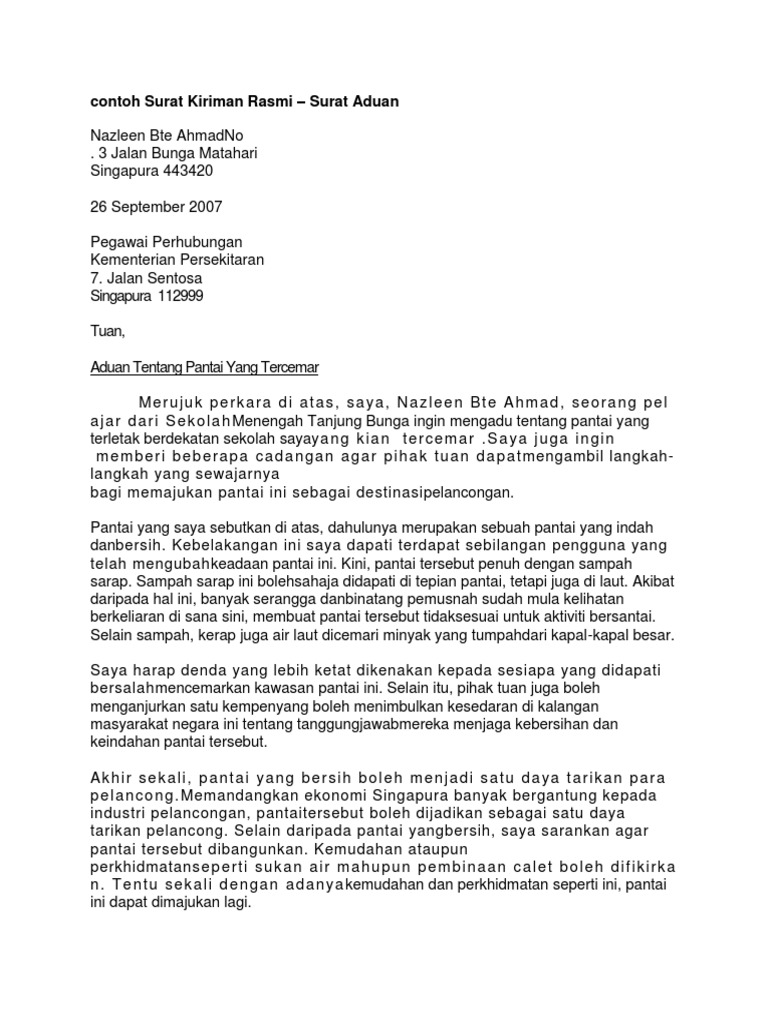 Contoh Surat Kiriman Rasmi Aduan Kawasan Perumahan Bermasalah